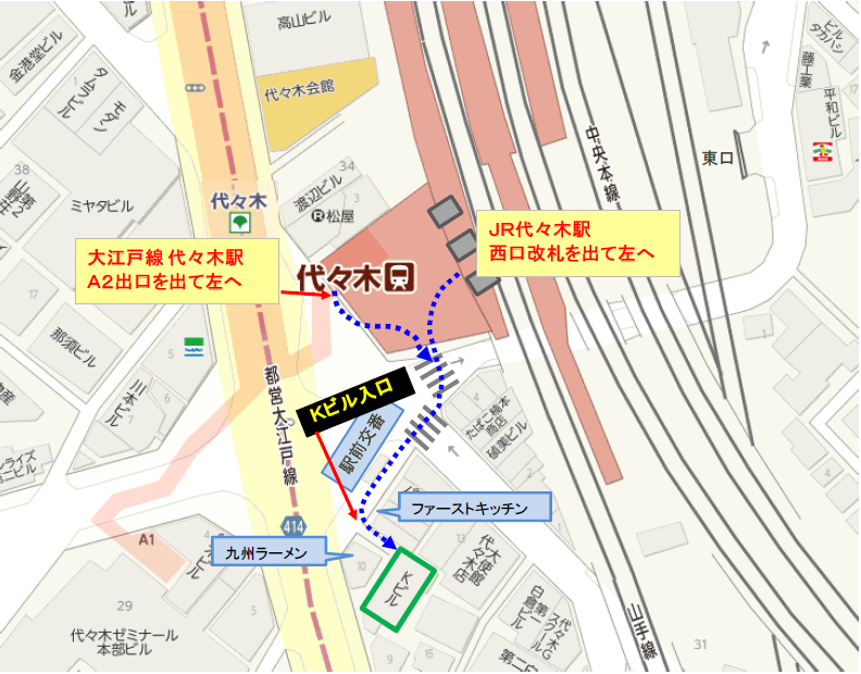 JR山手線代々木駅 西口改札を出て、横断歩道を渡ります。 代々木駅前交番とビルの間の道を進みますと、左側に「Kビル」の看板が見えます。 「Kビル」の看板が入り口となります。